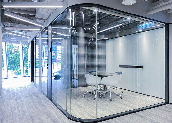 Arc-shaped negotiation rooms and conference rooms, with corporate culture glass glass film and LOGO, can be open or hidden. The wall thickness has various specifications. It uses 8/10/12MM tempered glass and has high structural stability.