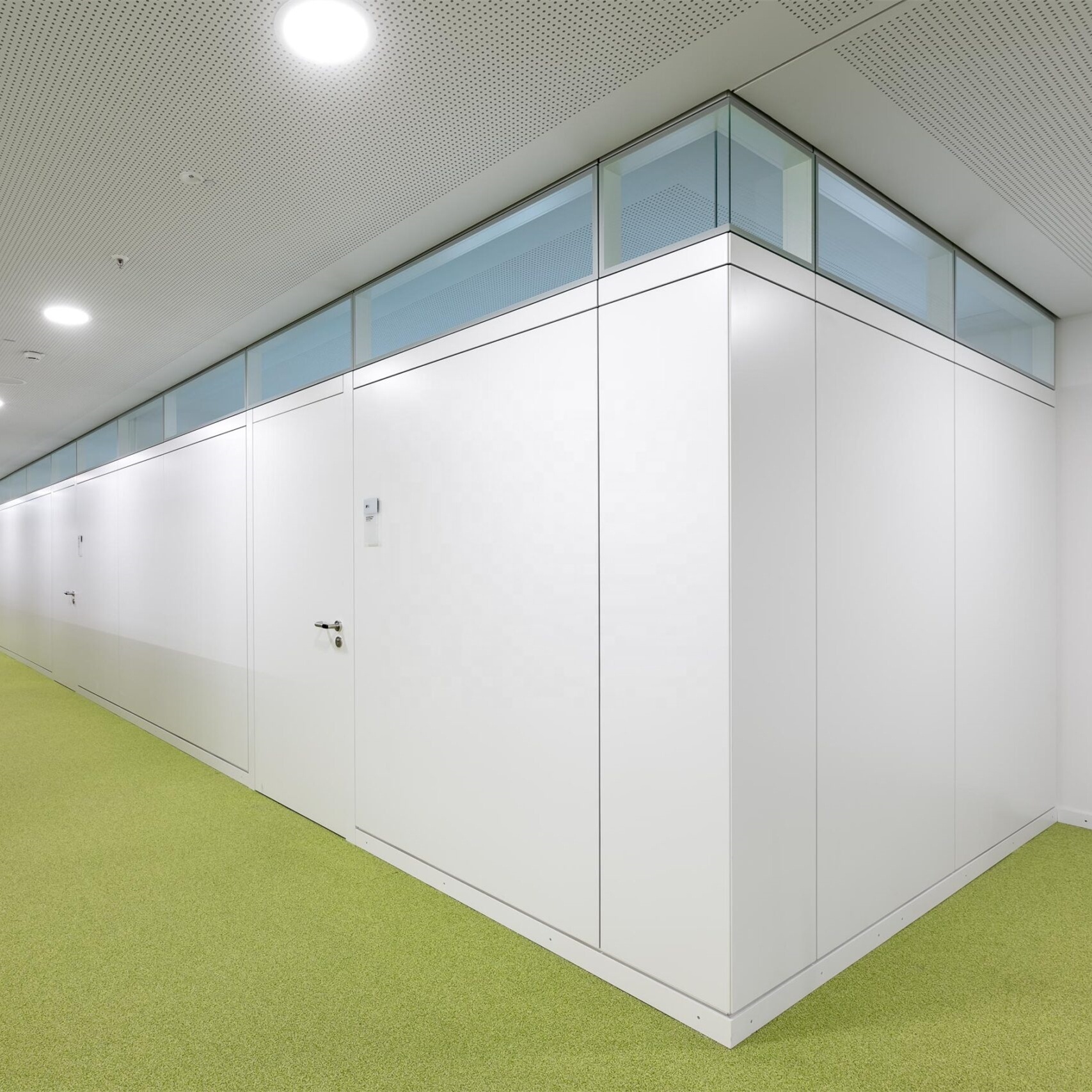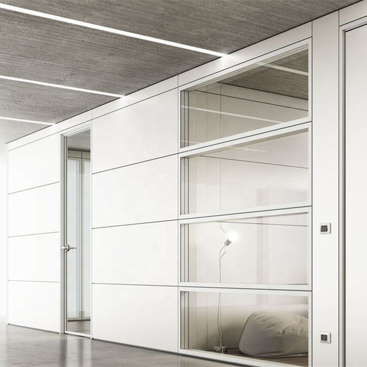 We have different types with single / double glazed or solid panels, glass can be clear tempered glass, frosted glass, painting glass, smart glass etc..Solid materials can be melamine laminate, HPL, Aluminum board, Steel plate.