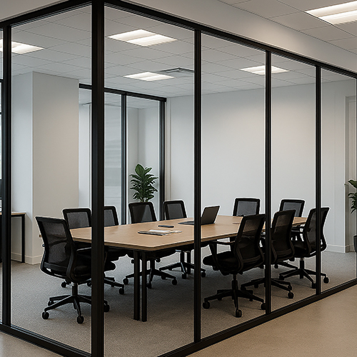 4) Modern Aesthetics: Glass partitions create a modern, professional look and flood the office with natural light, reducing reliance on artificial lighting.