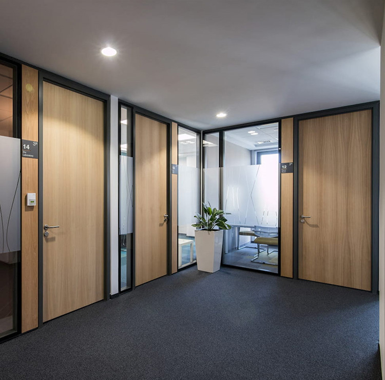 We have different types with single / double glazed or solid panels, glass can be clear tempered glass, frosted glass, painting glass, smart glass etc..Solid materials can be melamine laminate, HPL, Aluminum board, Steel plate.